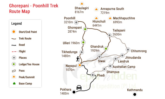 | Day 1 | Drive/flight to Pokhara — drive to Nayapul/Birethanti — trek to Tikhedhunga or Ulleri | Scenic drive, tea house stay |